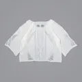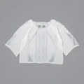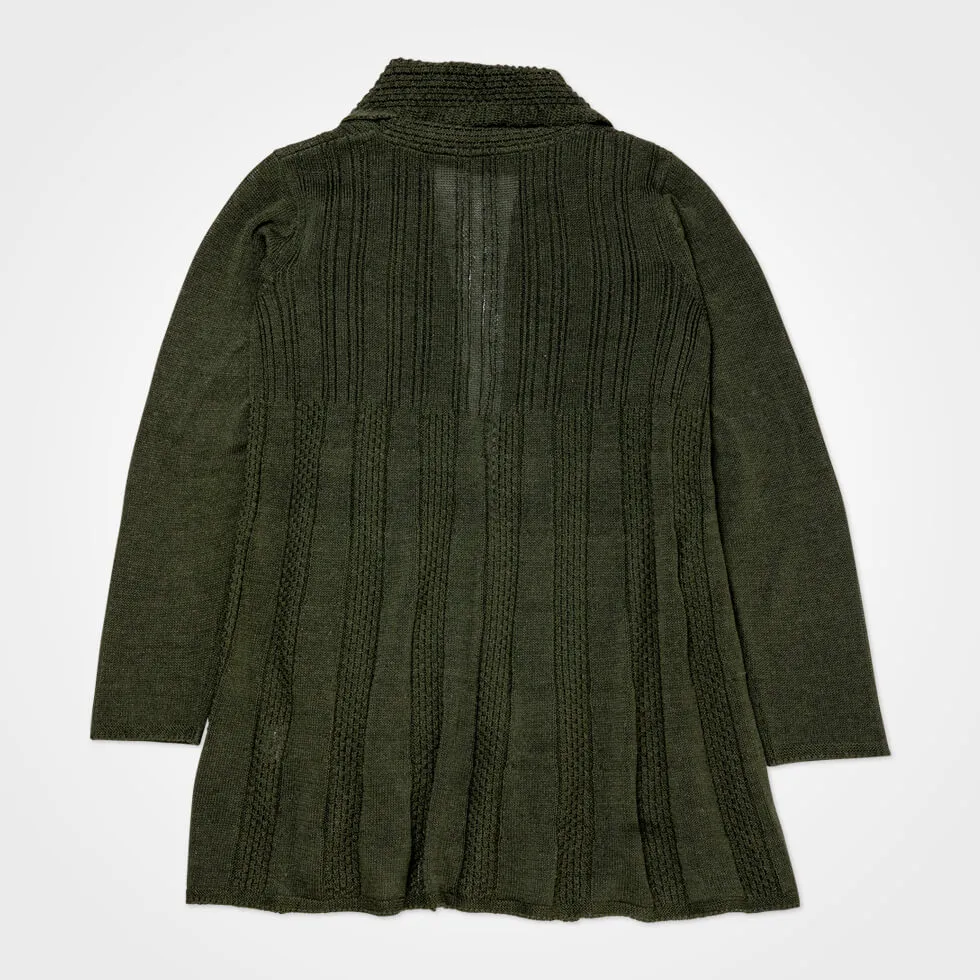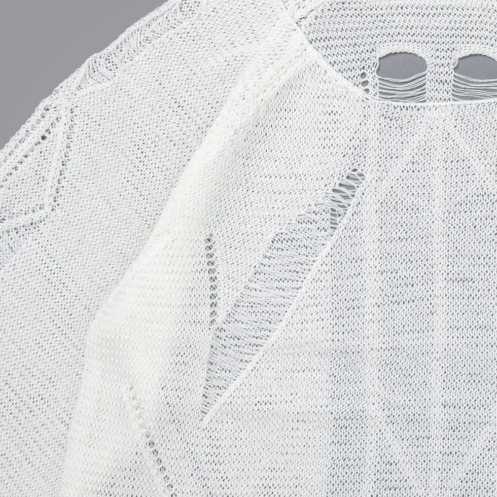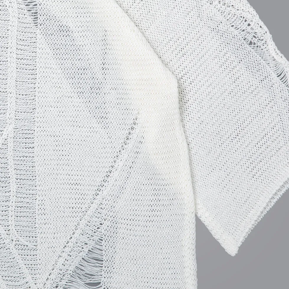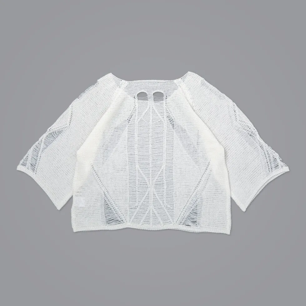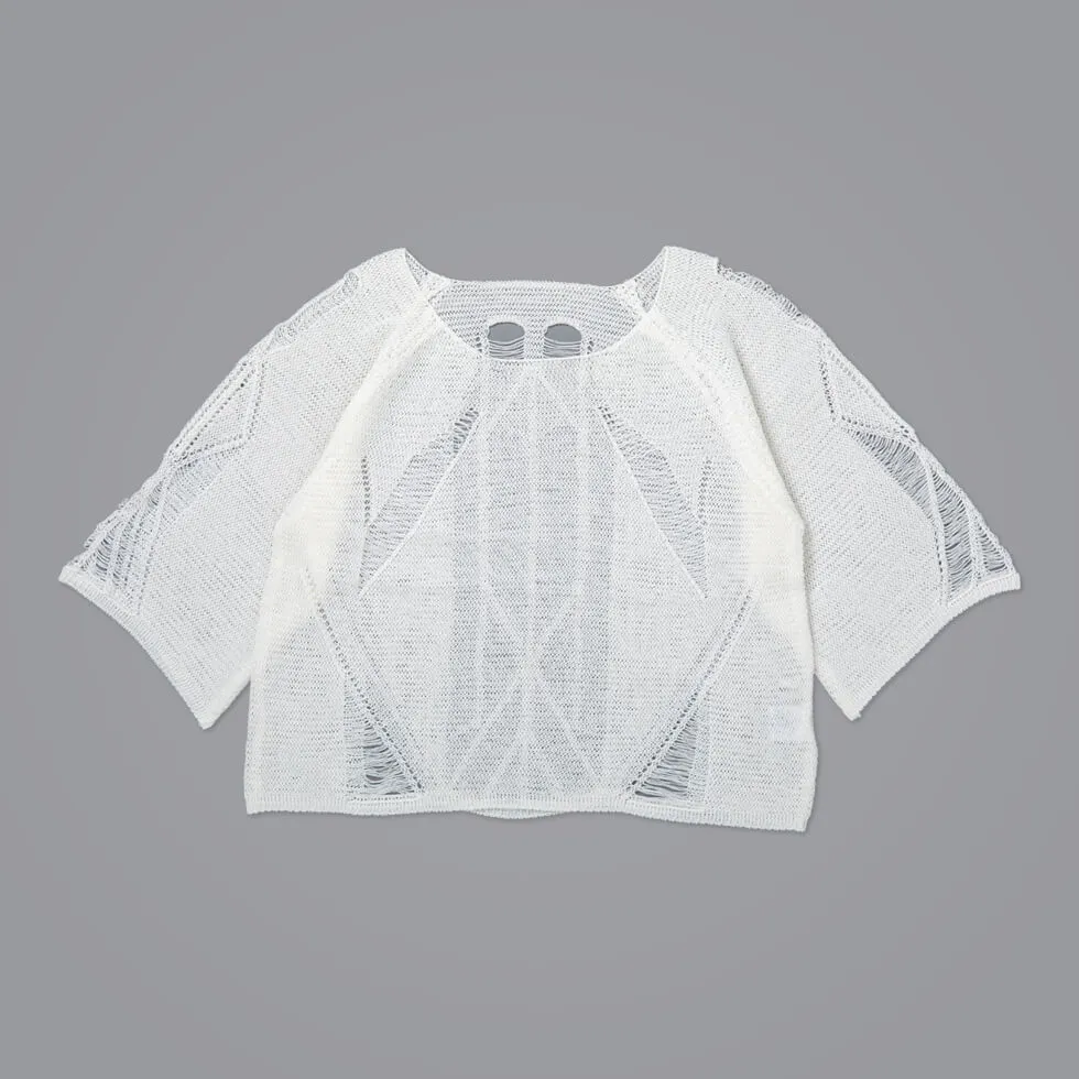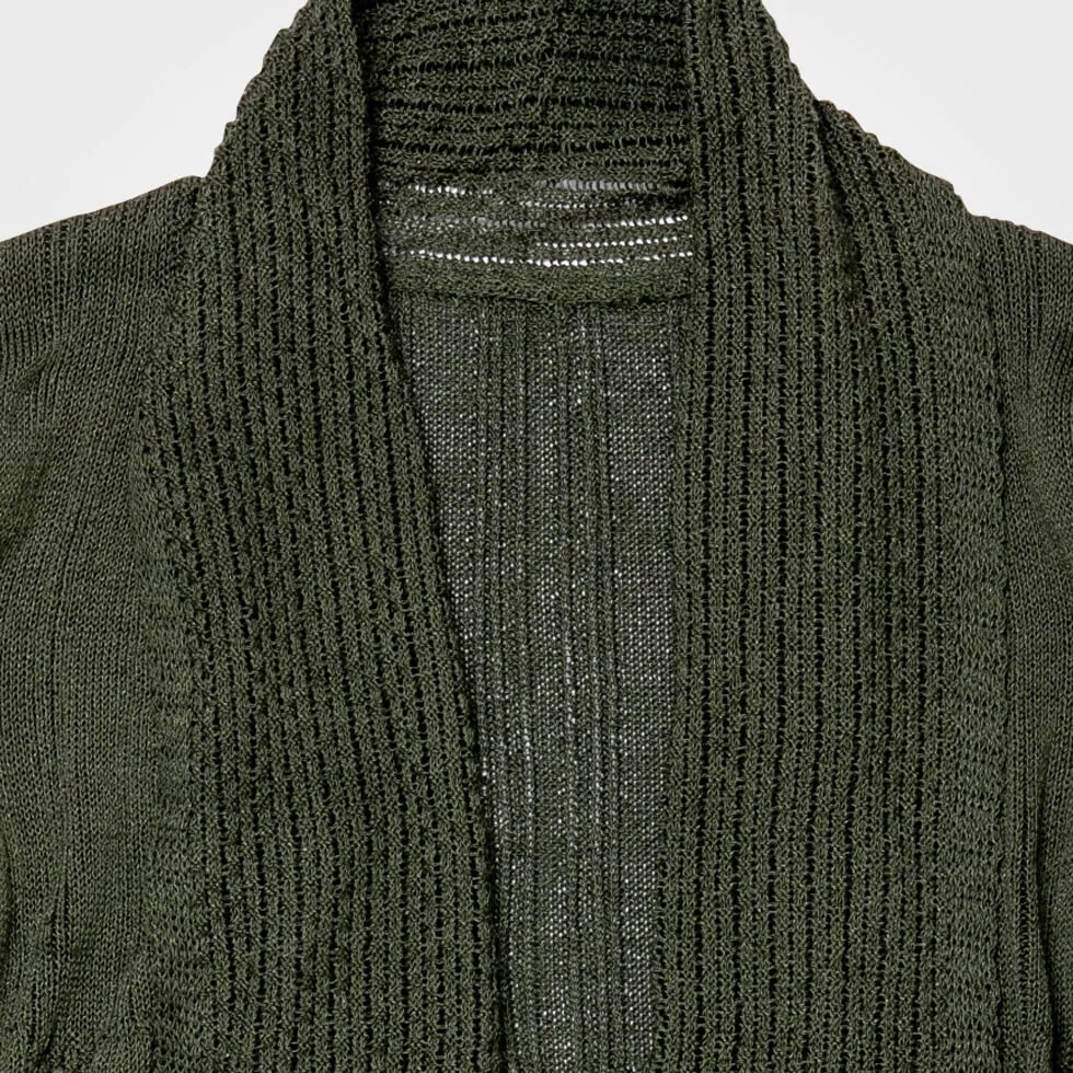 - 釦なしのトッパータイプ。スリーブ部分とボディーラインの編み方を変えペプラム風に仕上げています。ふんわりとしたシルエットになっています。