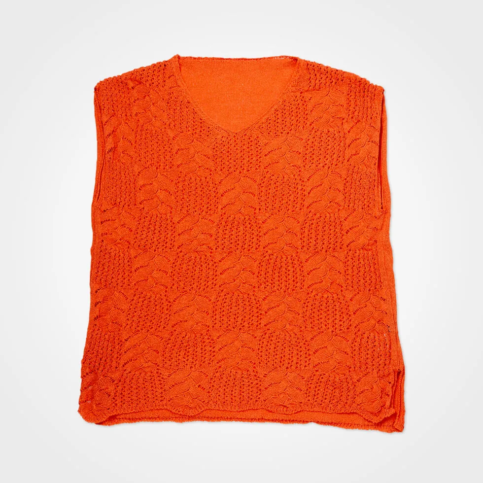 - 前後差をつけ、スリットを入れたV首ベスト。シャリ感のある生地と柄がベストマッチ。幅広い年齢層に着ていただけます。