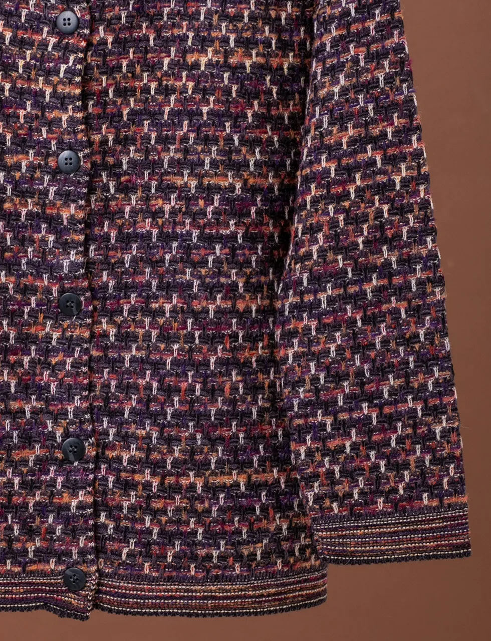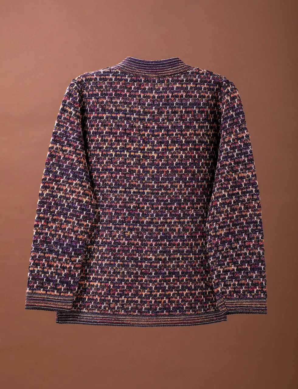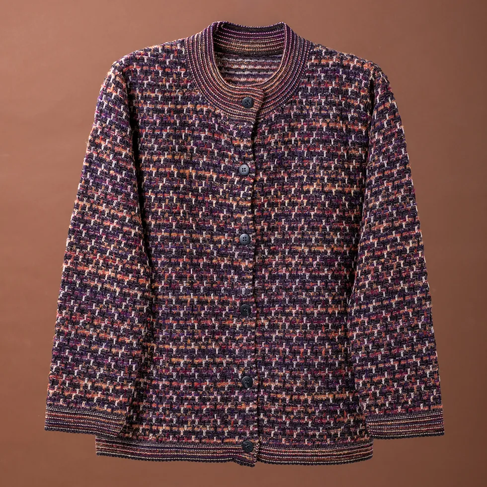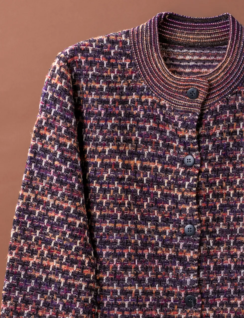 - さっと羽織るだけでコーデが完成、暖かみのある絣糸を使った釦付きカーディガンです。
