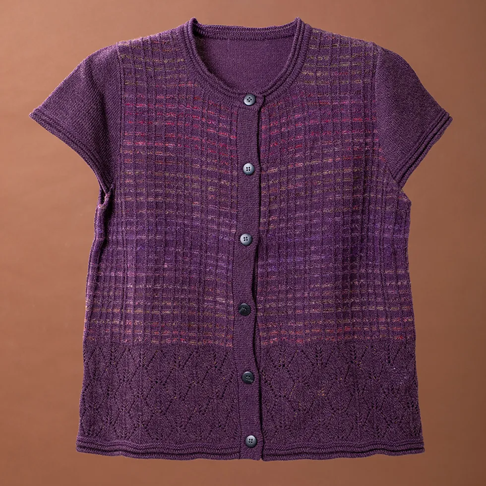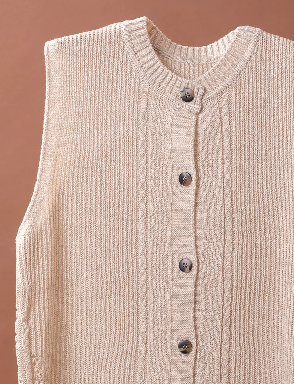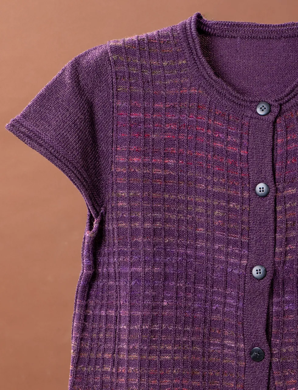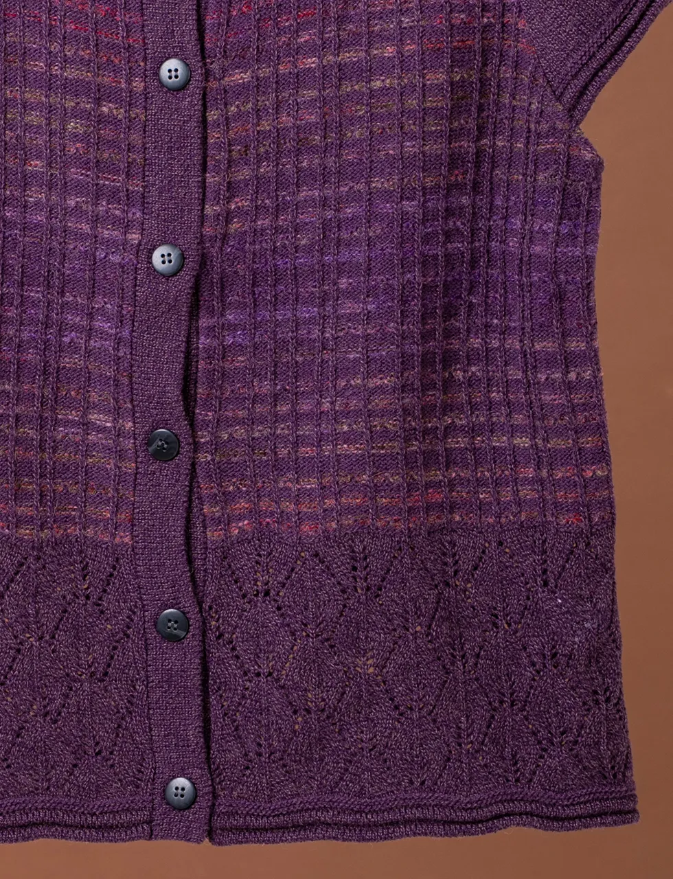 - モダンな編み柄の切り替えデザイン、美しい表情を見せる絣糸を使った釦付きベストです。