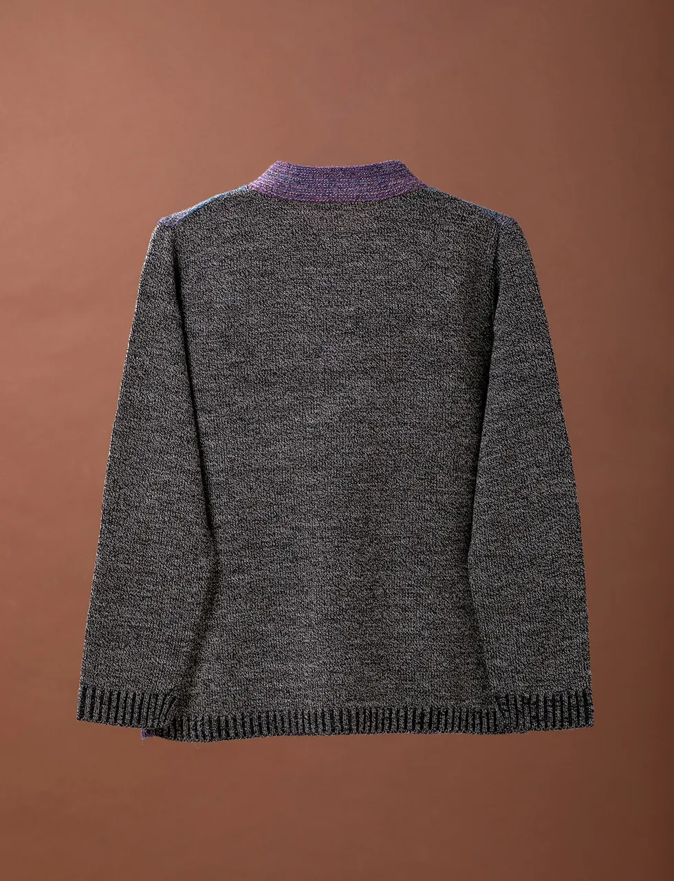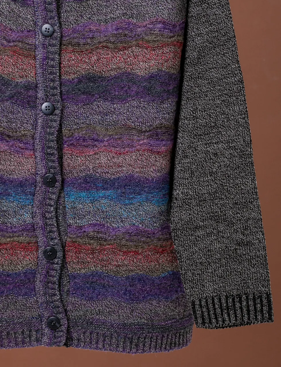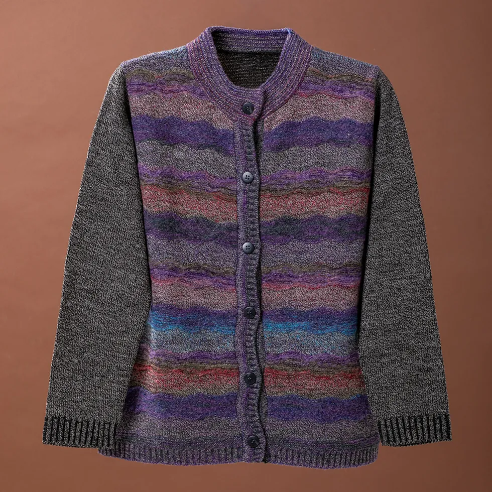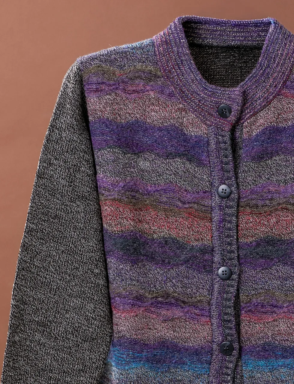 - 上品なグラデーションボーダー、落ち着いた色合いの絣糸を使った釦付きカーディガンです。